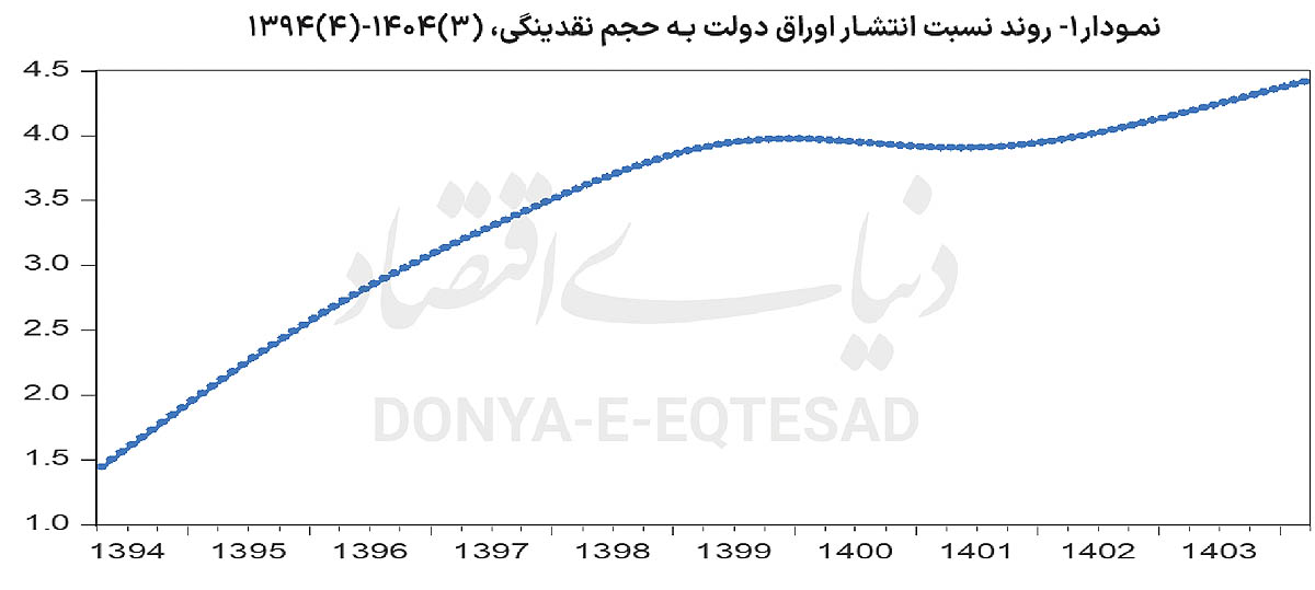 اگر سلطه مالی عام دولت ورای افزایش سطح عمومی قیمتها و نرخ ارز است، لازم است شواهدی ارائه کنیم که سلطه مالی دولت افزایش یافته است. برای پی بردن به افزایش سلطه مالی دولت، میتوان معیارهای مختلفی را بهکار گرفت. در نمودار ۱ روند یا ترند نسبت انتشار اوراق دولت به حجم نقدینگی برای دادههای ماهانه از تیر۱۳۹۴ تا خرداد۱۴۰۴ ترسیم شده است (قبل از این دوره داده وجود ندارد). علت استفاده از این نسبت آن است که خود انتشار اوراق بهعنوان یک متغیر اسمی حتما روند صعودی دارد.