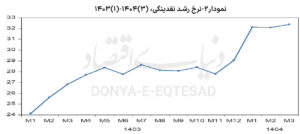 لازم است اشاره شود، منظور این نیست که رشد نقدینگی علت اولیه تورم است، بلکه به آن معنی است که سلطه مالی عام دولت حتما به رشد نقدینگی منجر میشود. بهدلیل همین افزایش سلطه مالی عام است که در طول ماههای اخیر هم نرخ سود افزایش یافته، هم رشد نقدینگی افزایش یافته است و هم نرخ ارز و تورم مسیر صعودی دنبال کردهاند. در نمودار 2 نرخ رشد نقدینگی برای دادههای ماهانه از ابتدای سال1403 تا خرداد 1404 نشان داده شده است.