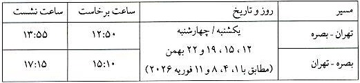 همچنین در مسیر بصره – تهران، ساعت برخاست پرواز 15:10 و ساعت نشست در مقصد 17:15 خواهد بود.