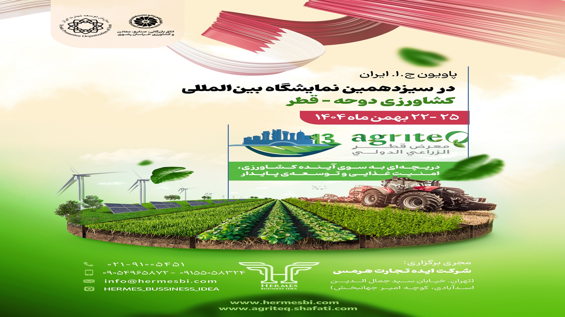 اتاق بازرگانی خراسان رضوی متولی برگزاری پاویون ج.ا. ایران در سیزدهمین نمایشگاه بین المللی کشاورزی دوحه قطر از تاریخ 22 لغایت 25 بهمن ماه 1404شد.