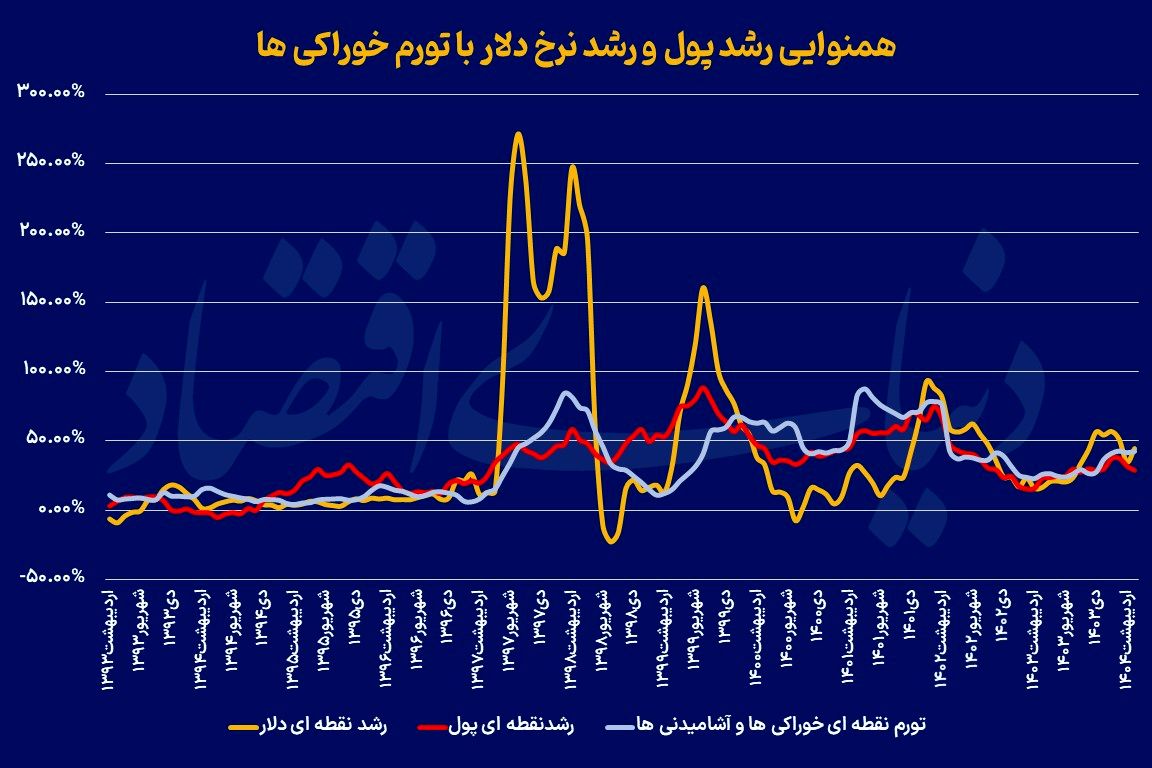 در حالیکه رشد پول از طریق تقویت انتظارات تورمی و افزایش نقدینگی در گردش، این شوک را در زمان تثبیت میکند. برای مثال، در سال ۱۳۹۹ رشد نرخ دلار از ۷۰ درصد به بیش از ۱۶۰ درصد رسید و همزمان رشد پول از ۶۰درصد به ۸۸ درصد افزایش یافت. در نتیجه تورم خوراکیها از ۲۰ درصد در تیر به بیش از ۵۶ درصد در آبان همان سال رسید و حتی با کاهش رشد نقطه به نقطه نرخ دلار در سال بعد، سطح قیمتها پایین نیامد. این پدیده از ماندگاری اثر نقدینگی بر تورم حکایت دارد.