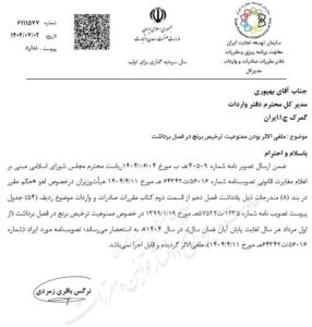 در بخشنامه‌ای اعلام کرد: «ممنوعیت ترخیص برنج در فصل برداشت از مرداد تا آبان» لغو و تصویب‌نامه مربوطه ملغی‌الاثر و غیرقابل اجراست.