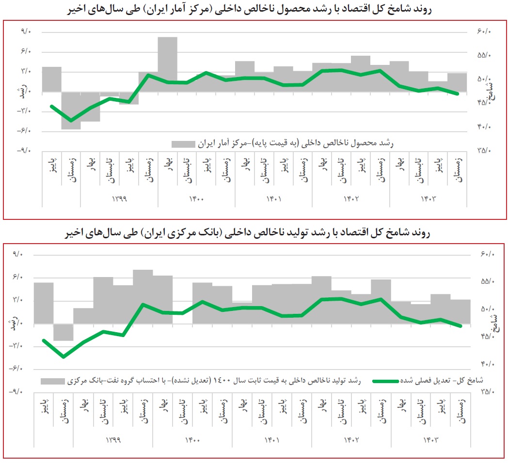 نکته قابلتوجه، همراستایی نسبی روند فصلی شامخ کل اقتصاد با روند رشد محصول ناخالص داخلی (مرکز آمار ایران) و روند رشد تولید ناخالص داخلی (بانک مرکزی ایران) طی فصلهای مربوطه در سالهای اخیر است و این روند در آمارهای مرکز آمار ایران بیشتر محسوس است. بنابراین، این همراستایی میتواند برای سیاستگذاری و تصمیمگیریهای اقتصادی کشور کمک مؤثری نماید.