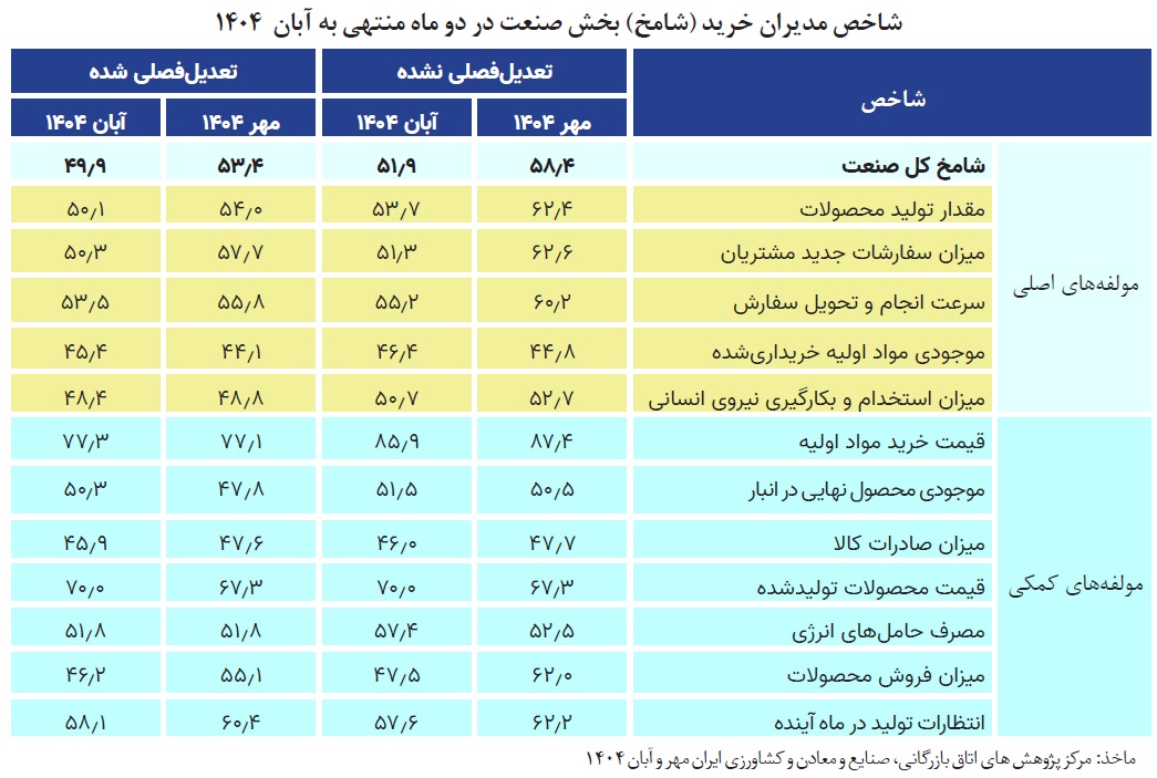 شاخص مدیران خرید بخش صنایع کارخانهای و تولیدی کشور، نمایی بهتر و بارزتر برای سنجش وضعیت کسبوکار و روند تغییرات تولید و فروش است. بر اساس دادههای حاصل از نظرسنجی میدانی به دست آمده از بنگاههای بخش صنعت، شاخص مدیران خرید صنعت ایران (تعدیلشده) در آبان ماه پس از دو ماه ثبات نسبی مجدداً به روند کاهشی خود بازگشته و کمترین مقدار سهماهه خود (49.9) را به ثبت رسانده است؛ ازاینرو نگرانی از تداوم رکود در صنعت کارخانهای را افزایش داده است.