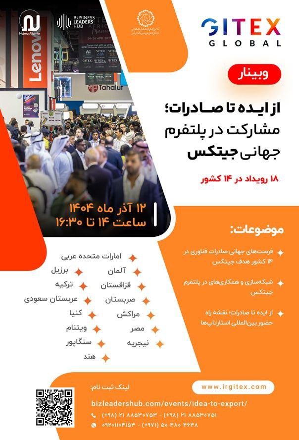 در همین راستا، فدراسیون فناوری اطلاعات و ارتباطات ایران با همکاری کمیسیون فناوری اطلاعات و ارتباطات اتاق ایران در نظر دارد برگزاری وبینار تخصصی «از ایده تا صادرات؛ مشارکت در پلتفرم جهانی جیتکس» با هدف معرفی ظرفیتها و فرصتهای صادراتی در بازارهای هدف و تبیین راهکارهای بهرهمندی از پلتفرم جهانی جیتکس، را در روز چهارشنبه ۱۲ آذرماه ۱۴۰۴ از ساعت ۱۴ تا ۱۶ برگزار کند.
