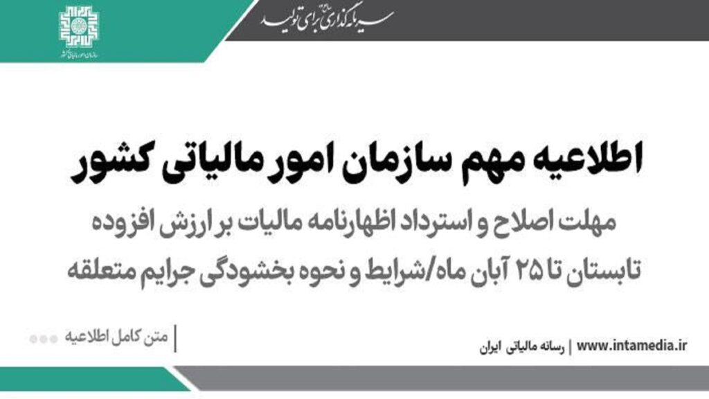 سازمان امور مالیاتی کشور، ضمن شرایط و نحوه بخشودگی جرایم مالیات بر ارزش افزوده دوره تابستان 1404، مهلت اصلاح، تکمیل و استرداد مالیات بر...