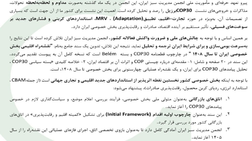 اطلاعیه پیشنویس نقشه راه اقلیمی بخش خصوصی براساس بیانیه cop30 و همکاری مشترک